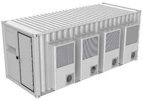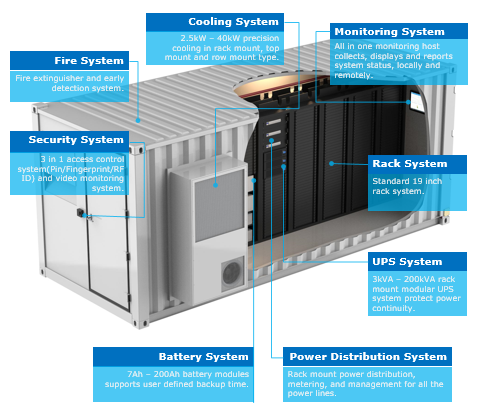 Fully integrated with ISO container, cabinet, UPS/DC power, battery, cooling, monitoring, security, and fire systems.
