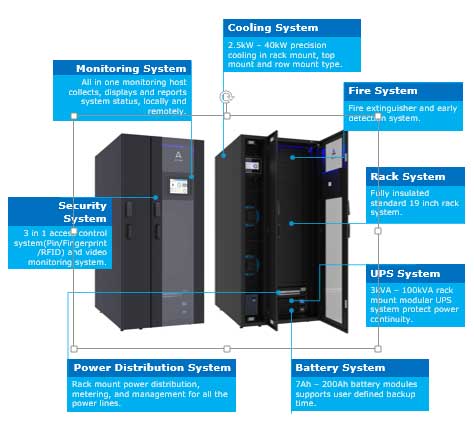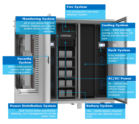 Fully integrated with indoor type rack, UPS power, battery, cooling, monitoring, security, and fire systems.